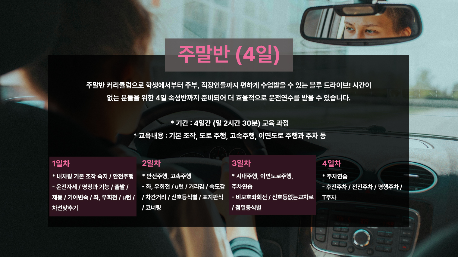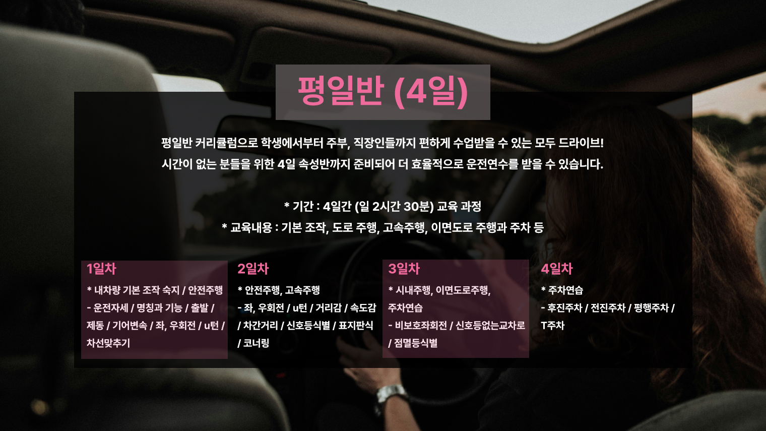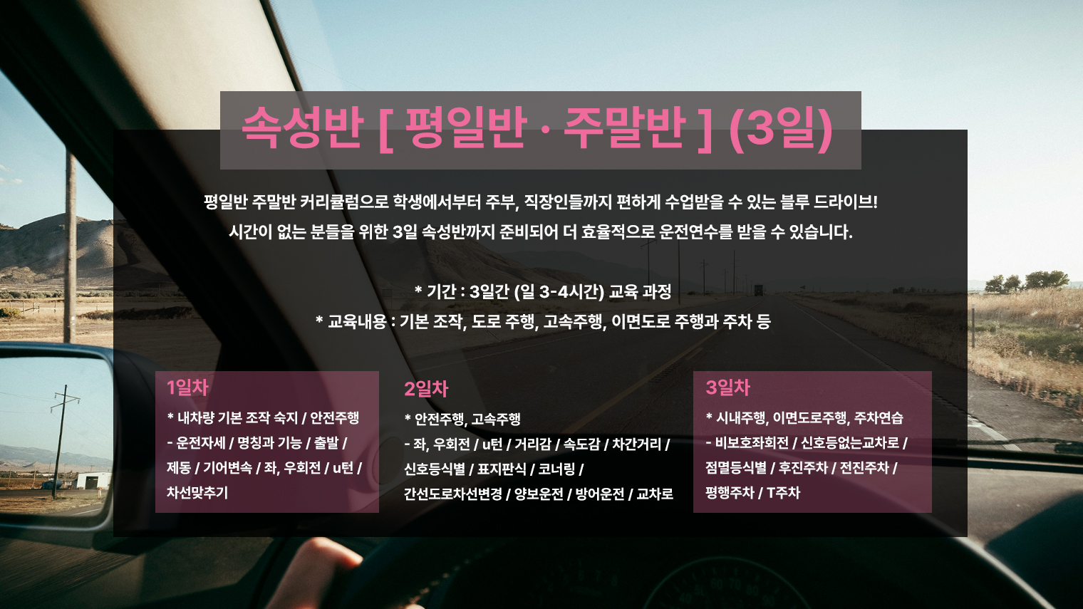 여성 운전자분들이 도로에 대한 두려움을 줄이고, 안전한 감각을 되찾을 수 있도록 구성된 1:1 맞춤형 실전 연수입니다.